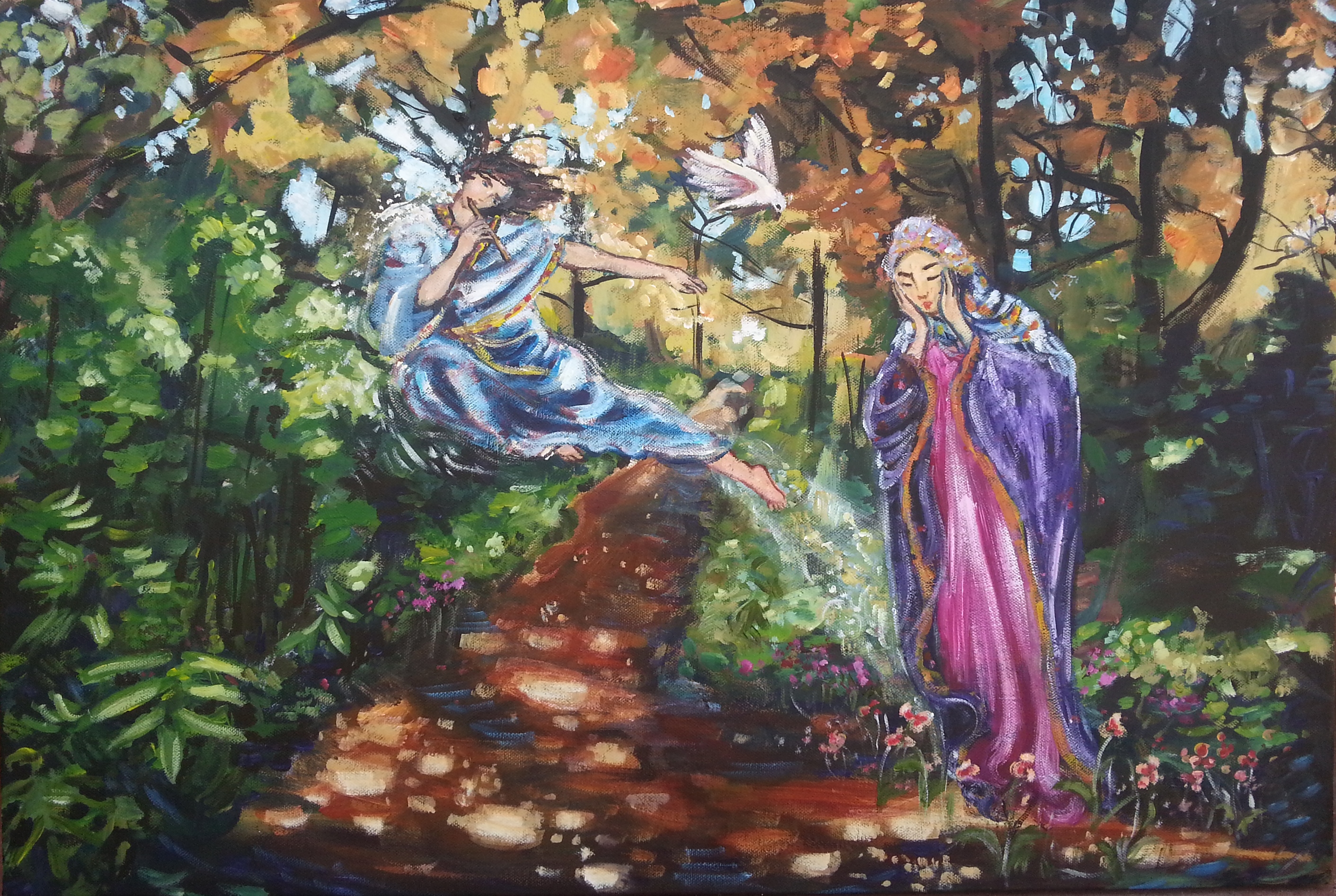 I was inspired by some of the renaissance and pre-raphaellite artists. I love the way the supernatural/spiritual realm often interacts and collides with the earthly and temporal. Angels and bodies can float, size and gravity is obsolete…yet nature still peaks through in sunlight on leaves and folds of material. It’s something worth remembering, too, that the spiritual realm goes beyond fantasy. Like the wind, you can’t see it, but it is there.