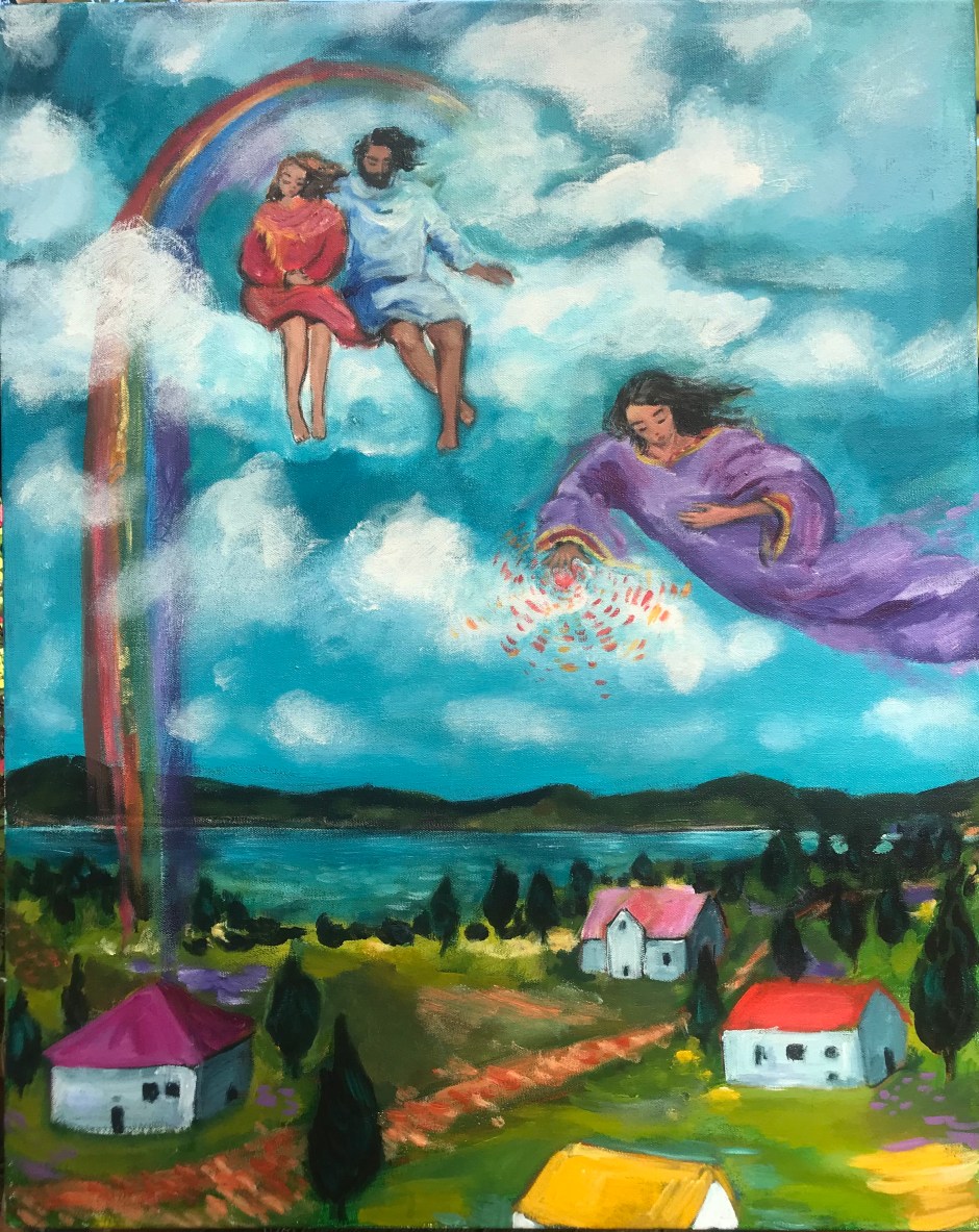 A rainbow is God’s way of showing us multifaceted colours of provision and care. A rainbow is eternal truth visible in technicolour. Imagine it as a radiant spectrum of Grace molecules. It lands on the rooftops of our houses, waters the ground we walk on, and dampens our skin and our hair like so many glistening diamonds. A rainbow houses cloud dwellers And Shepherds the Spirit, as she weaves her magic over every horizon. And those who watch over us, the closest of soul friends Are wrapped around us like a cosmic blanket. When we step away from our dreaming bodies we can return their embrace.